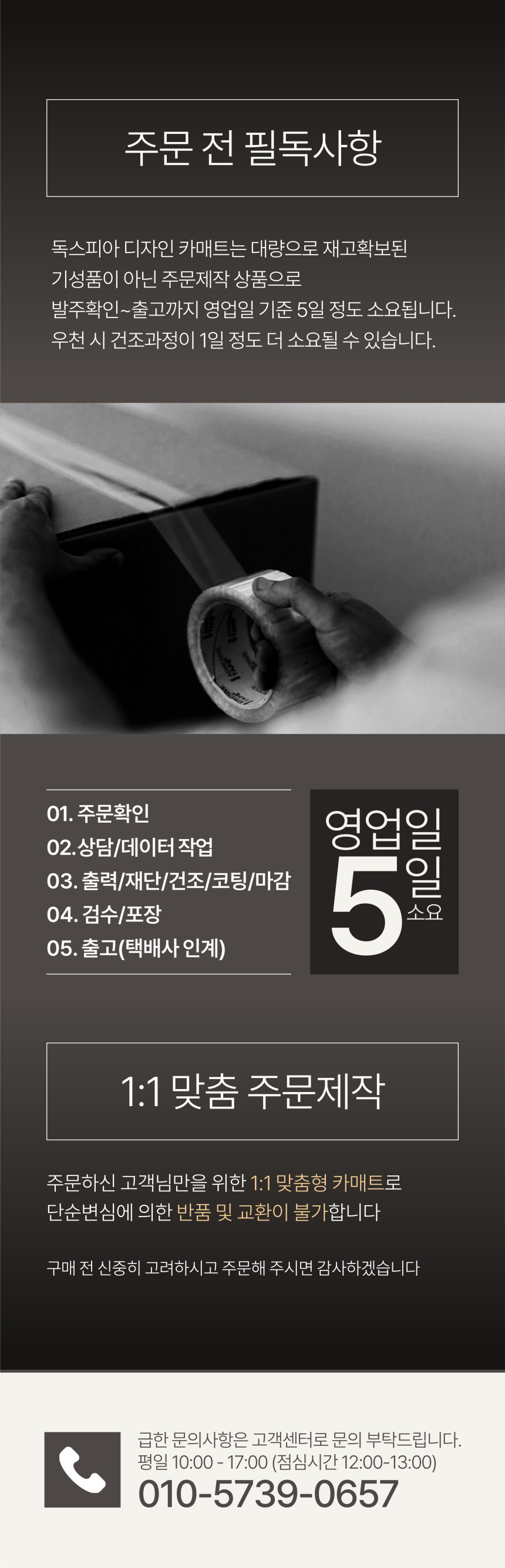 - 유의 사항 : 주문폭주 및 공급 사정 또는 천재지변으로 택배발송 지연이 발생될 수 있습니다. 기본 배송기간 이상 지연 예상될 경우, 독스피아 쇼핑몰 전체 개별 공지사항 참고 바랍니다.