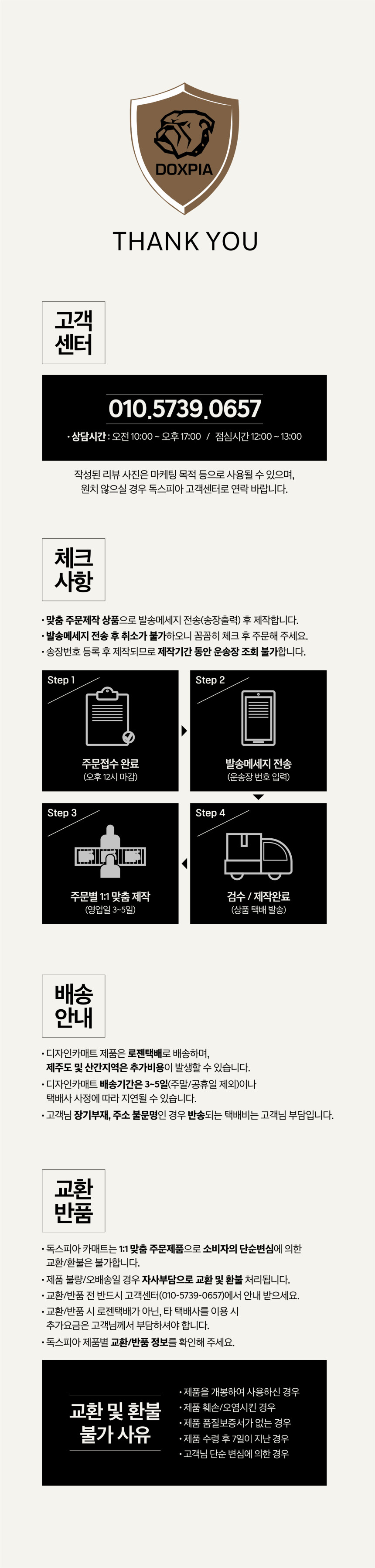- 유의 사항 : 주문폭주 및 공급 사정 또는 천재지변으로 택배발송 지연이 발생될 수 있습니다. 기본 배송기간 이상 지연 예상될 경우, 독스피아 쇼핑몰 전체 개별 공지사항 참고 바랍니다.
